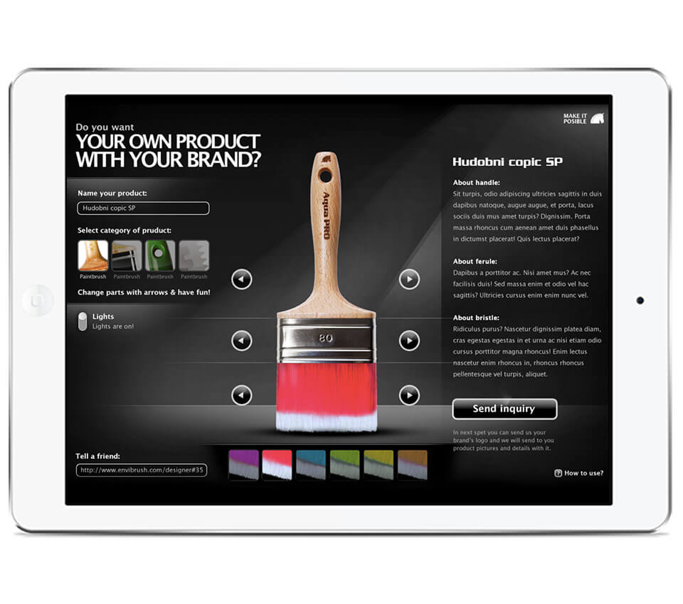 Za največje slovensko podjetje ščetk in valjčkov smo načrtovali, oblikovali in izdelali mobilno aplikacijo za tablice, ki omogoča sestavo lastnega izdelka iz široke paletne možnih kombinacij za OEM program.